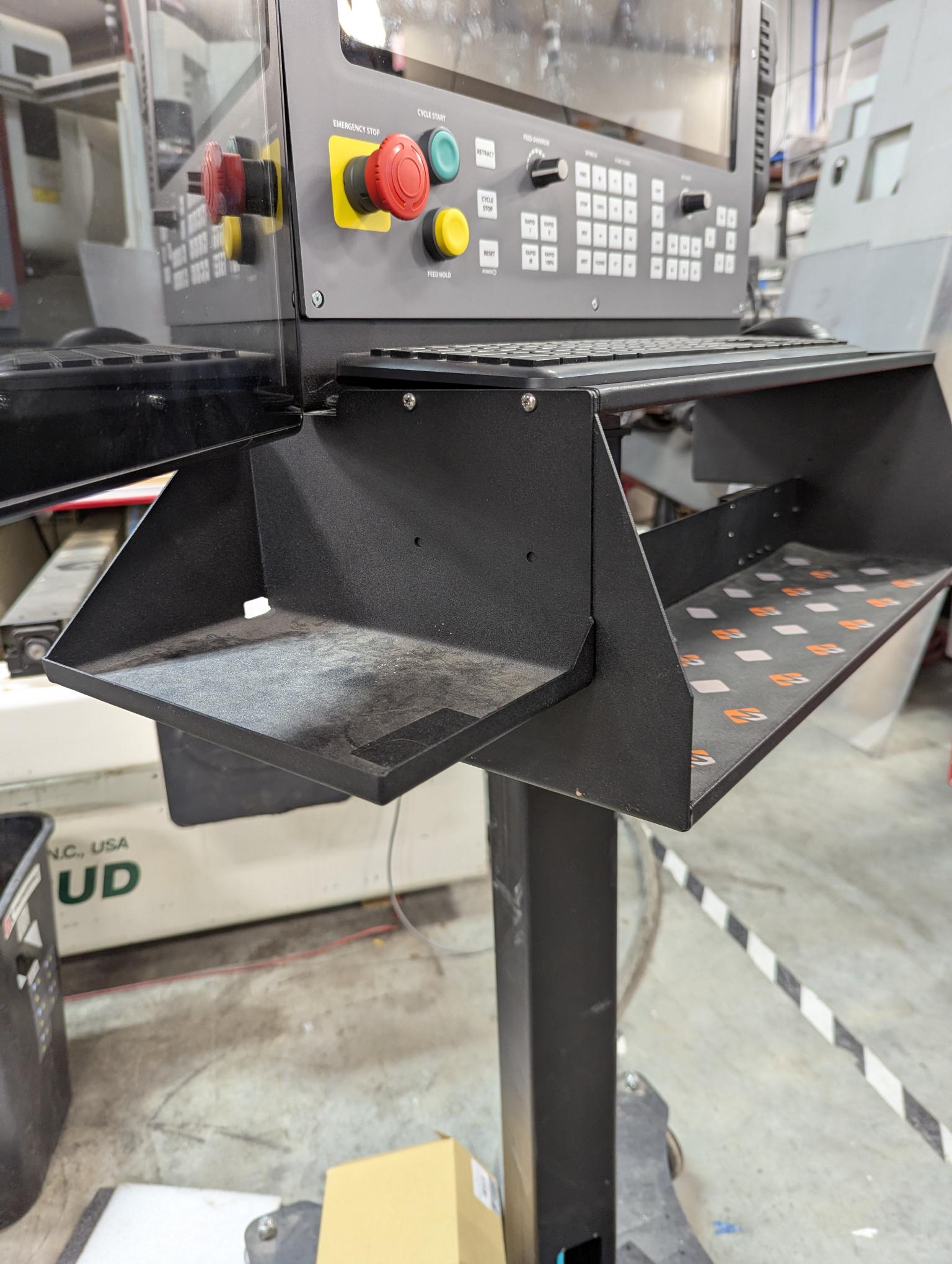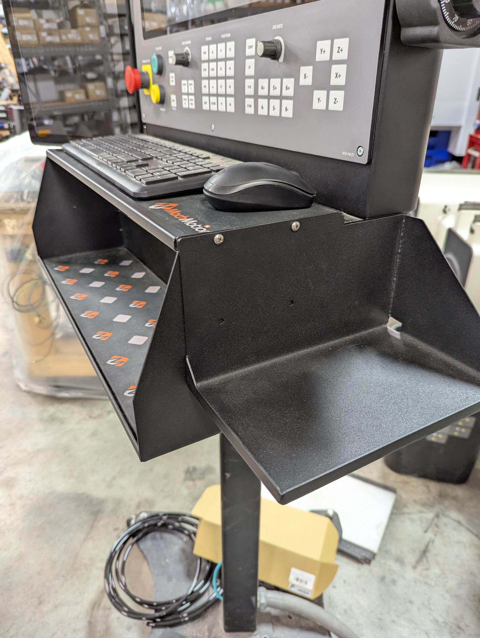 One person hold the center Tray up and another bring in the outer trays and screw them in. The same hole on the keyboard tray holds both the center tool tray and the outer tool trays (note that the outer tool tray on the monitor side will need to use a stubby driver or mount tool tray before monitor).