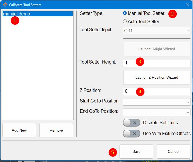 - To create a new manual tool setter, press 'Add New'. All tool setters must have a unique name. After naming the tool setter, select it from the list, and the settings for that tool setter will be shown on the right-hand side.