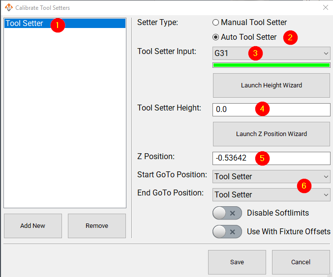- If the tool setter is permanently mounted and the Z position does not change, the Z position wizard can be used to determine this number. Once it is set correctly, it will not need to be changed. Set a GoTo position so that the spindle will always go to the setter before touching off. If the setter is mounted outside of soft limits, toggle 'Disable Softlimits'.