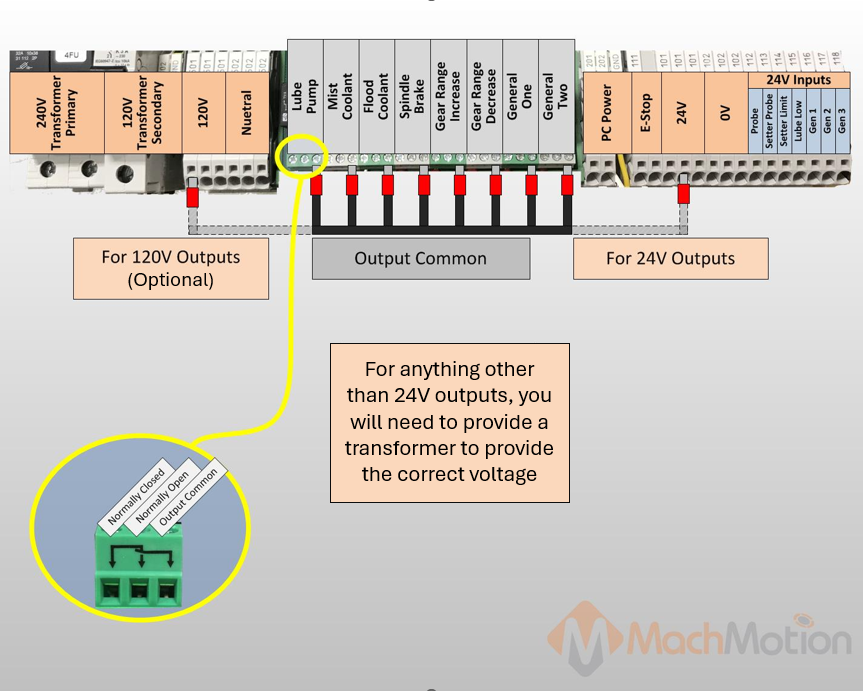 Please note, the output common comes pre-jumpered to the 24v circuit. Verify the voltage of each output destination before wiring.