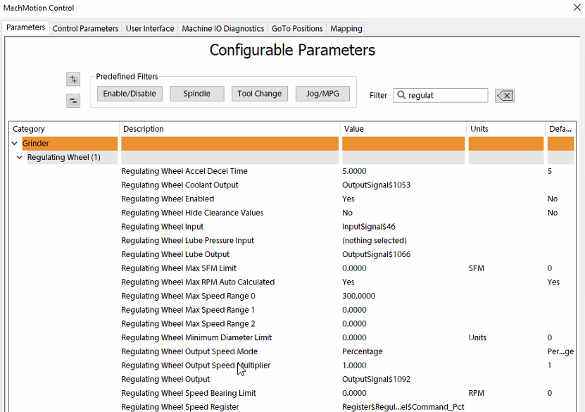 Set up the regulating wheel in MachMotion Parameters as shown: