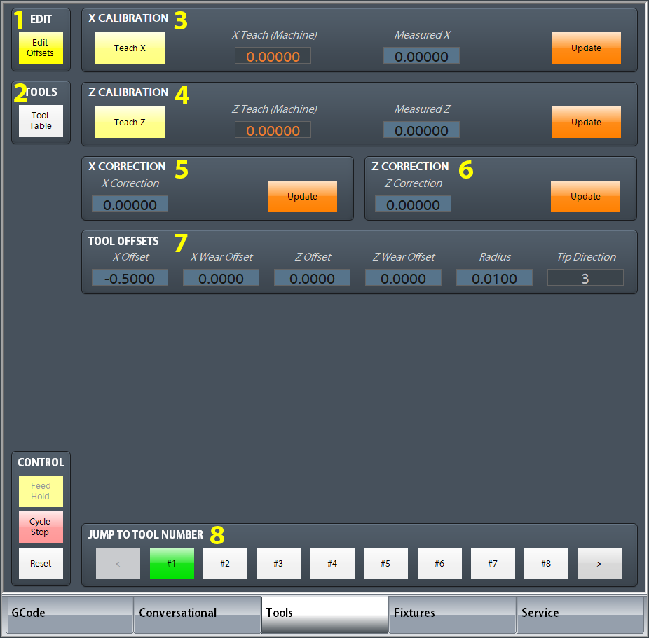 - Edit Offsets - No offset changes can be made unless this value is yellow. It also displays the zero buttons near the DROs to the right.