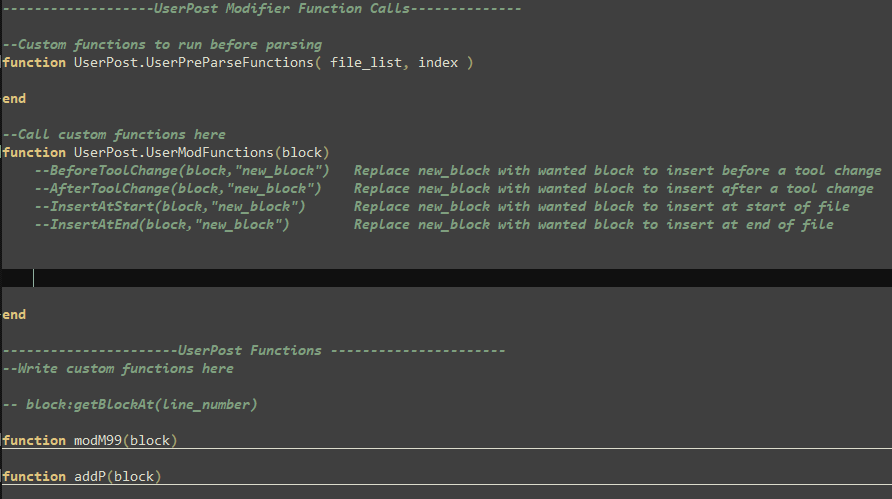 These tables will automatically call the modifier functions and are a helpful way to make simple modifications to GCode files. These modifiers are ran on every block of GCode in the file. When adding to the tables, copy and paste the examples and replace what you want to easily keep the correct format.
