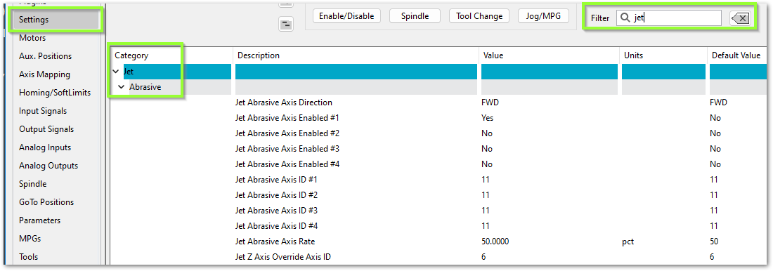 | Jet Abrasive Output(s) | Turns on and off abrasive for the corresponding jet. |
