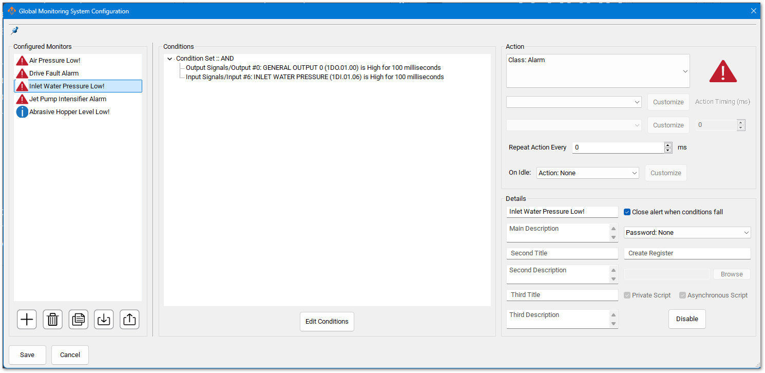 You may have inputs for Low Inlet Water Pressure. Configure a GMS to monitor this signal as follows: