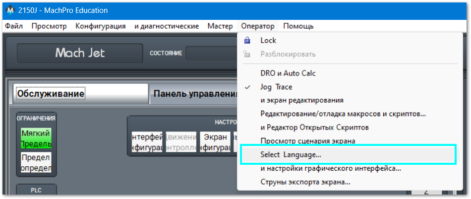 - From the main MachPro screen, pull down the Operator menu and click Select Language