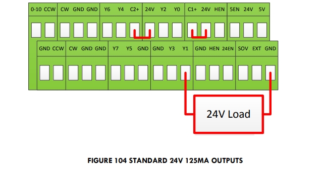 For standard operation the outputs can have their commons jumpered to 24V on the Apollo III. At that point simply connect the load to the output and GND. See the figure below.