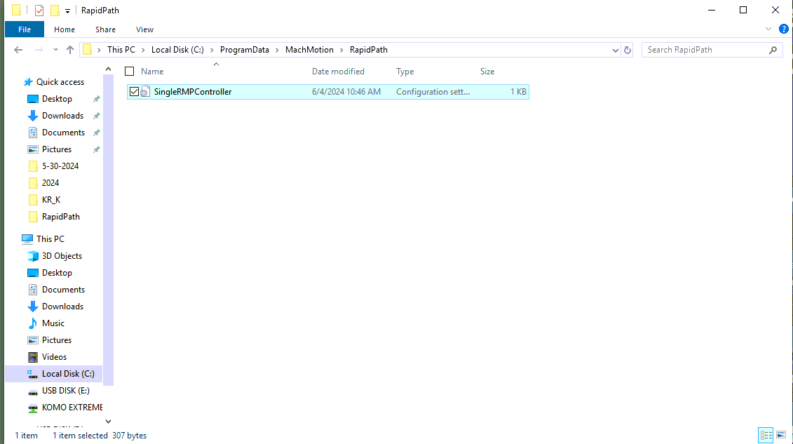 - Copy the SingleRMPController file to the desktop in case you need to recover it. Next you will delete this file from the directory. (ProgramData>MachMotion>RapidPath) Then open Mach and home the motor or motors in question. This will result in the file being regenerated under the current user Domain and unlock the file for future use.