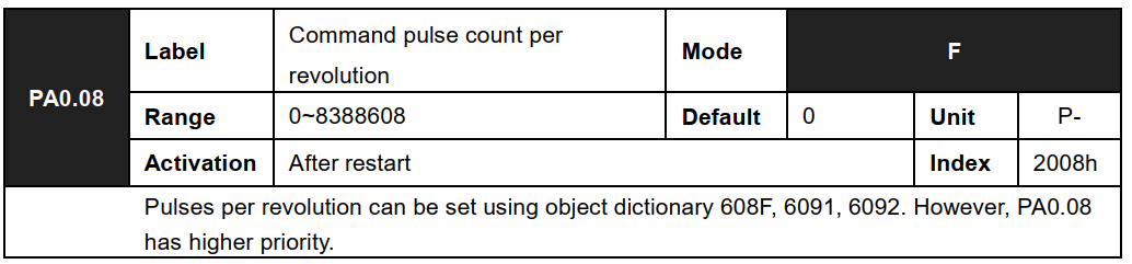 | PA0.08 | 1st command pulse count per revolution | 131072 | Restart | 0x2008 |