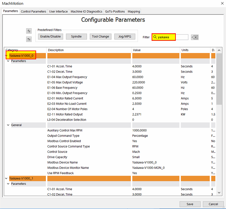 Note: All Mach Parameters will be labeled as "Yaskawa V1000_0" even for V1000, A1000 and GA500 type VFDs.