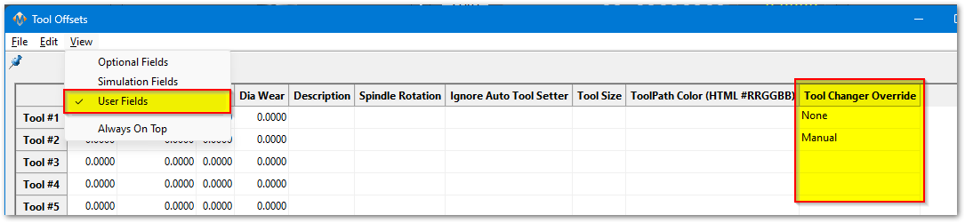 - Under the View menu, select User Fields and the Tool Changer Override column will be displayed.