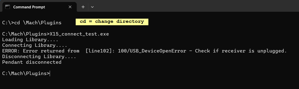 6. Type in the name of the test utility and press enter to run it. The first example shows a failed test - no pendant receiver is plugged into any of the USB ports.