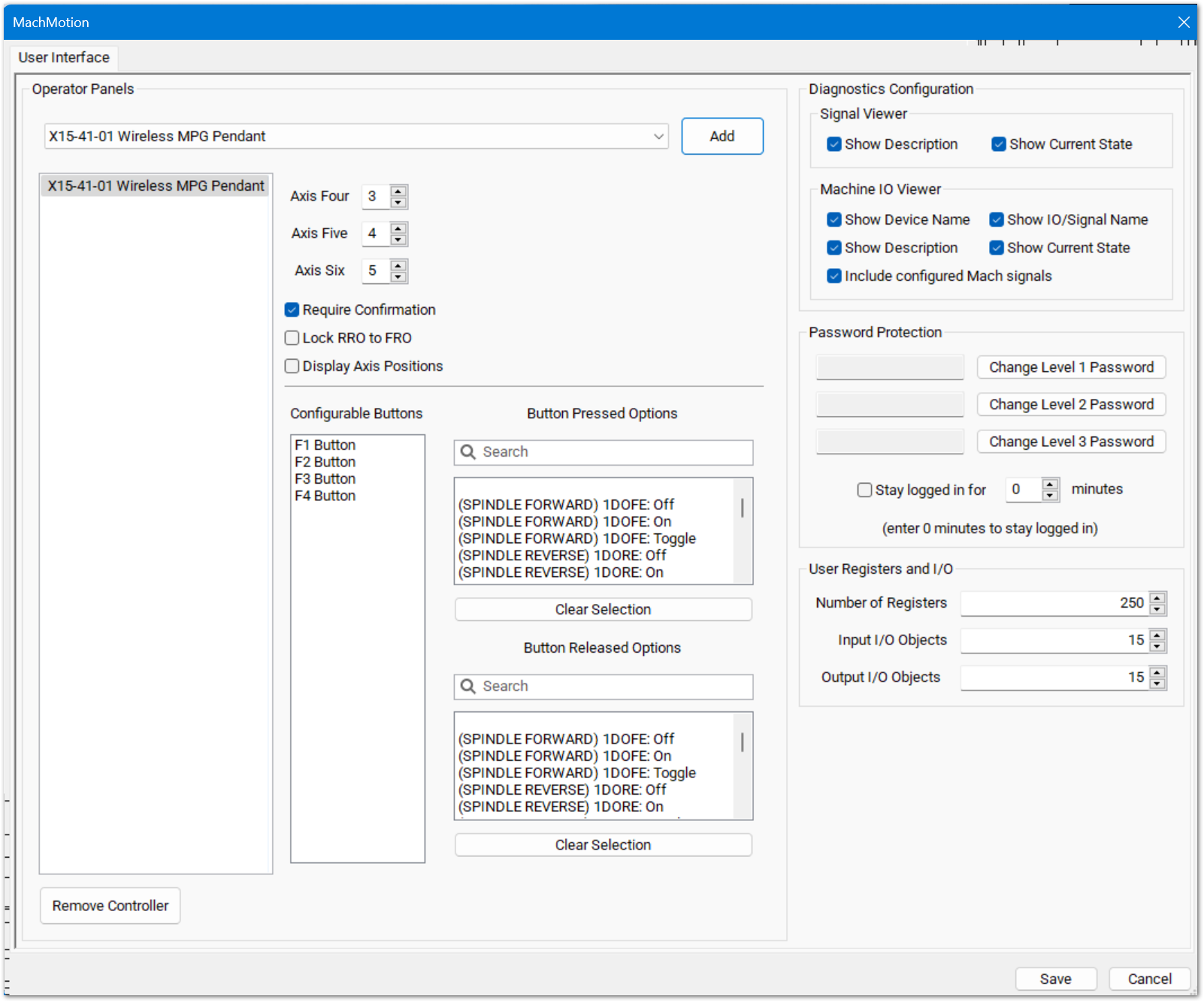 The pendant has four configurable function buttons. The options for these buttons are shown in the pressed and released options. First select which button should be configured, then select which command it should perform.