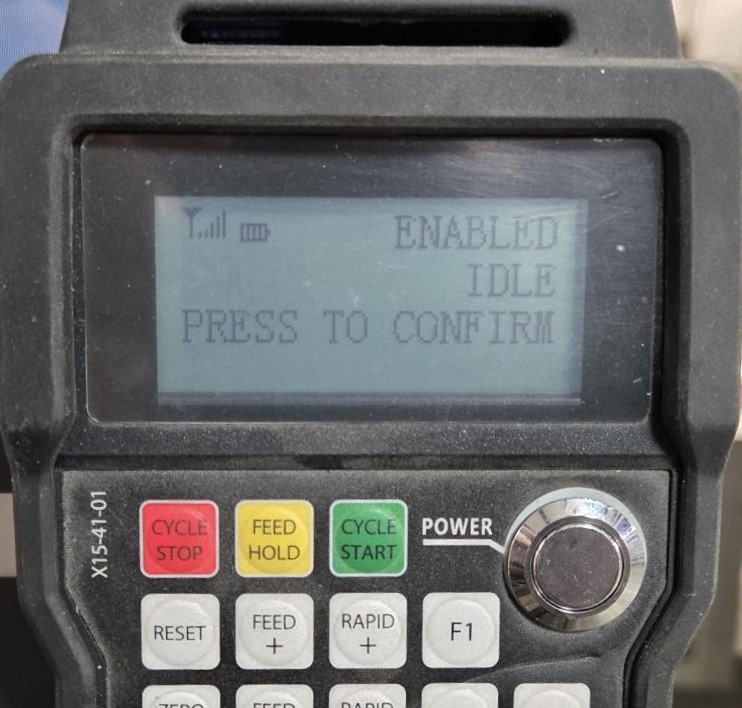 If the pendant is waiting for a confirmation press, then the message about waiting for confirmation and which function is being confirmed will be displayed on lines three and four.