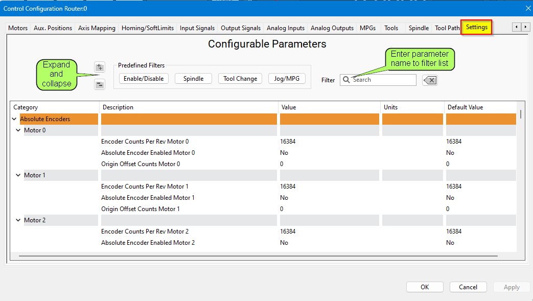 The Settings tab options are listed below. Many of the settings are defined per axis or motor. If the settings are the same for all instances, then they will only be described one time.